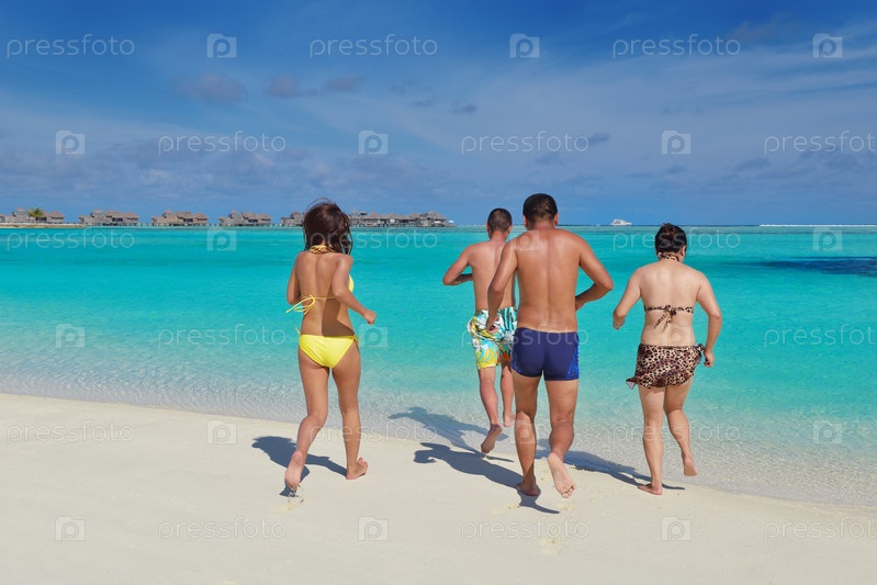 Группа счастливых молодых людей веселится на пляже