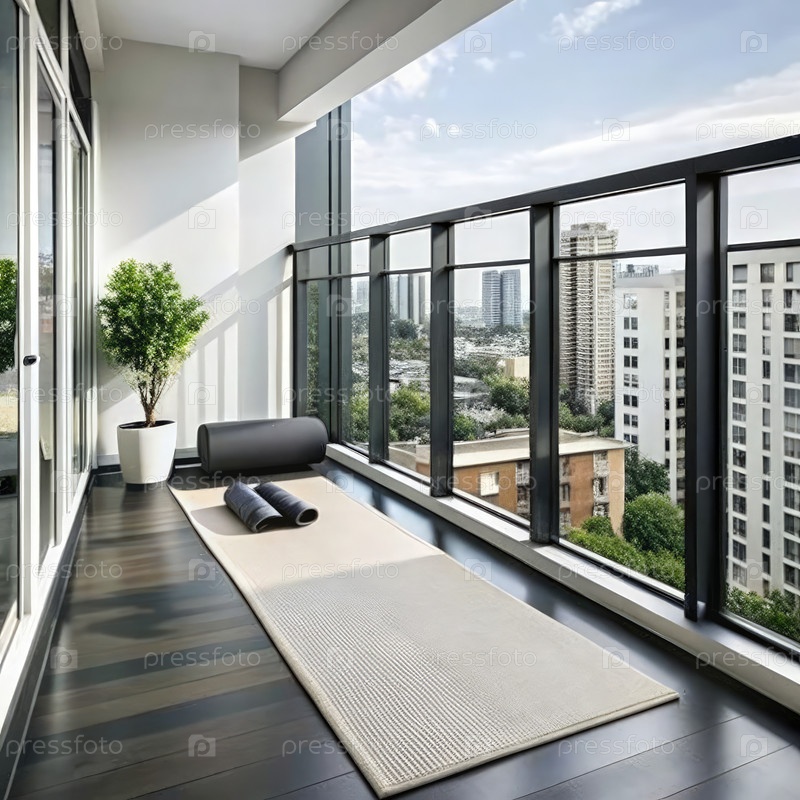 Минималистский балкон с ковриками для йоги с видом на городской горизонт в дневное время