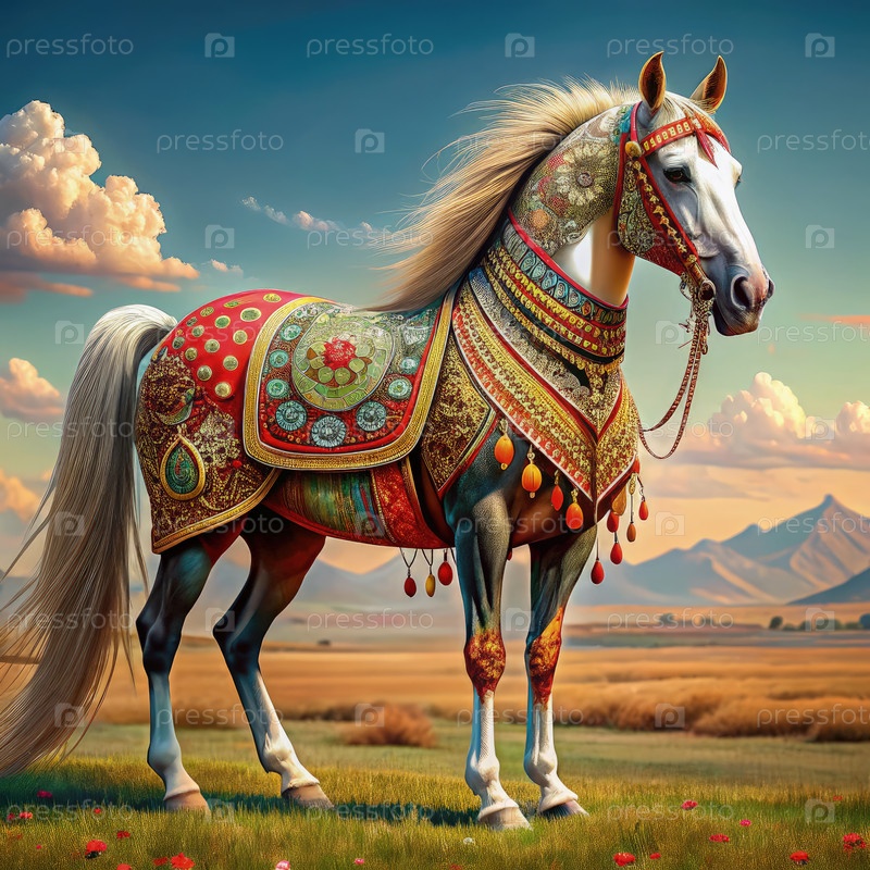 Украшенный турецкий конь, украшенный сложными мотивами в живописной сельской местности