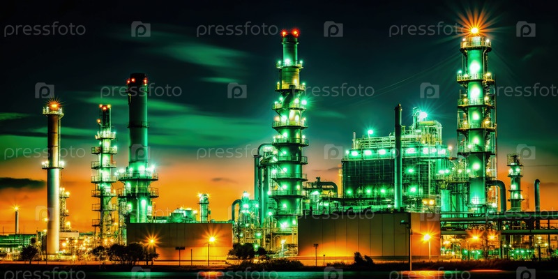 Ночной вид нефтеперерабатывающего завода с освещенными башнями и промышленной деятельностью