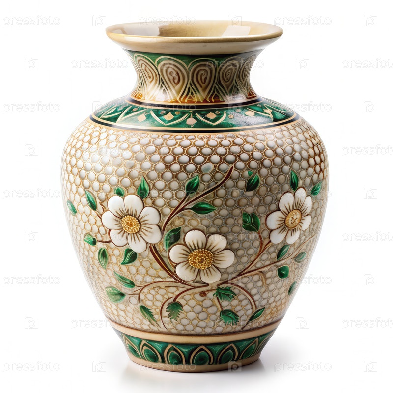 Декоративная ваза с цветочным дизайном, расположенная на белом фоне