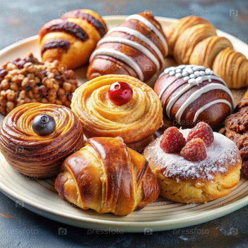 Вкусный ассортимент свежей выпечки, отображаемый на керамической тарелке