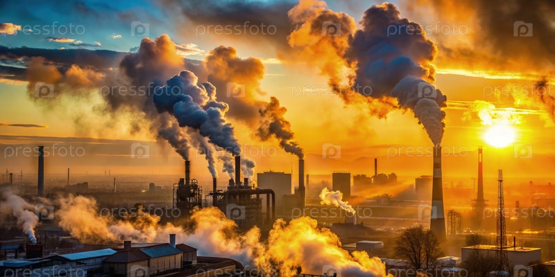 Драматический закат солнца, освещающий загрязненный промышленный ландшафт с раздувающимися дымовыми трубами и оранжевым небом