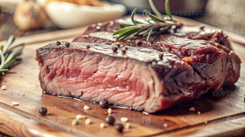 Близкий план идеально приготовленного стейка, опирающегося на деревянную режущую доску, украшенную свежим розмарином и перцовыми зернами в окружении ингредиентов-приправ