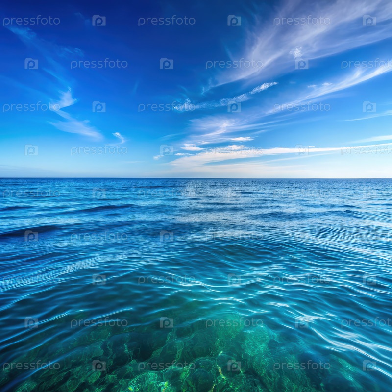 Спокойное синее море с чистой водой и дальним горизонтом под солнечным небом