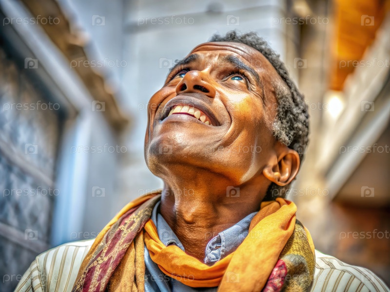 Человек, смотрящий вверх с радостью и удивлением на оживленном переулке в яркий день