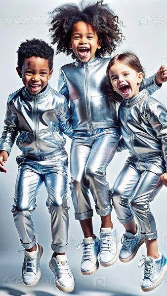 Дети смешанной расы в серебряных нарядах радостно прыгают и смеются вместе в игривой обстановке студии