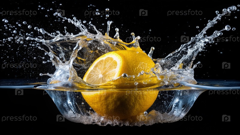 Свежий лимон брызгает водой на черном фоне, захватывая динамическое движение и яркий цвет