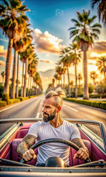 Панк-водитель наслаждается закатом солнца вдоль улицы, облицованной пальмами