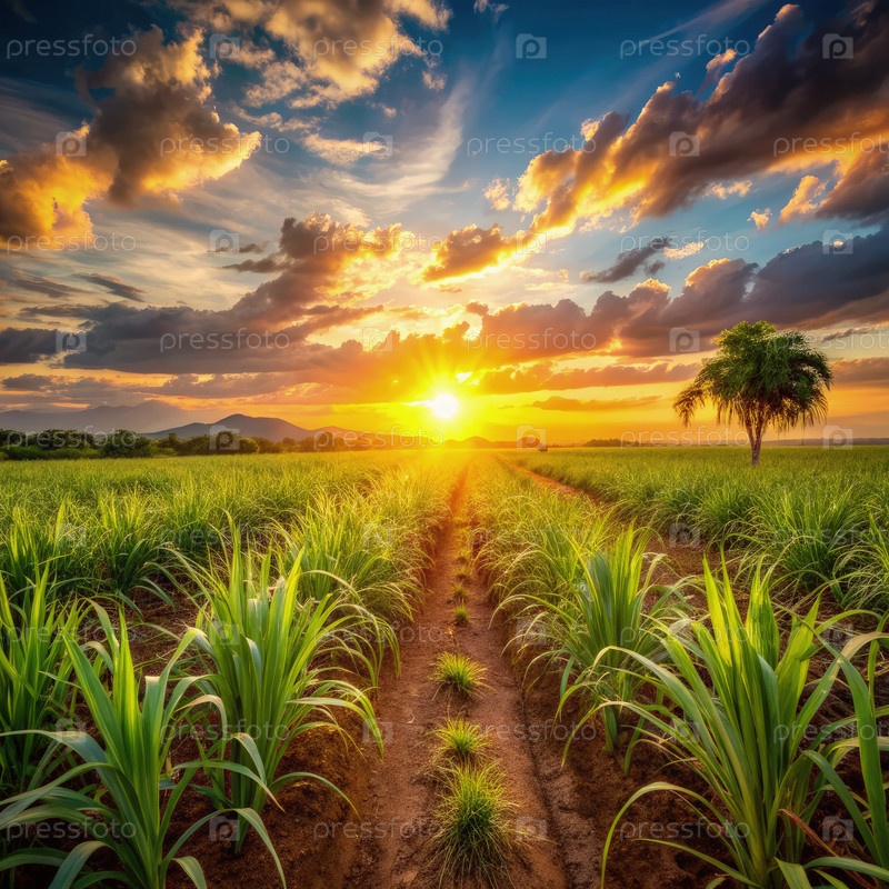 Закат солнца над пышным полем сахарного тростника с драматическими облаками на заднем плане