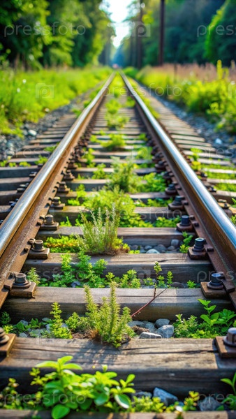 Близкий взгляд на переросшие железнодорожные пути, окруженные пышной зеленой растительностью в начале лета