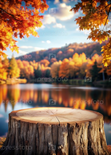 Пустая стадия продукта, сделанная из вырубленного дерева против спокойного пейзажа на берегу озера осенью