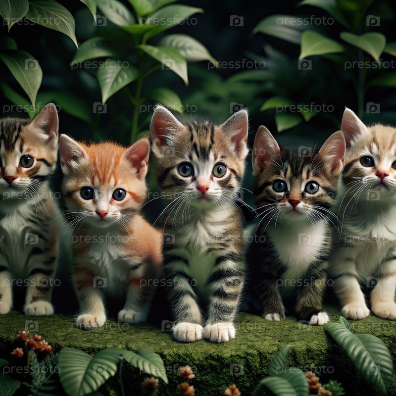 Милые пушистые котята, сидящие среди пышной зелени в спокойной обстановке