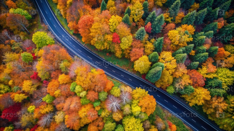 Вид с воздуха на извилистую асфальтированную дорогу через яркую осеннюю листву
