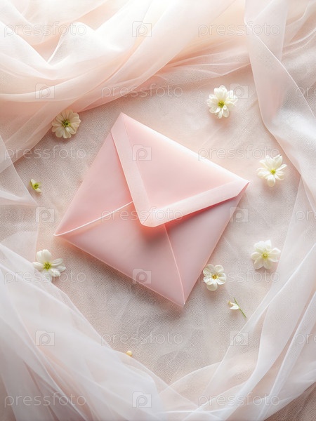 Розовый конверт, опирающийся на белую световую завесу, окруженную нежными цветами для выставки свадебных приглашений