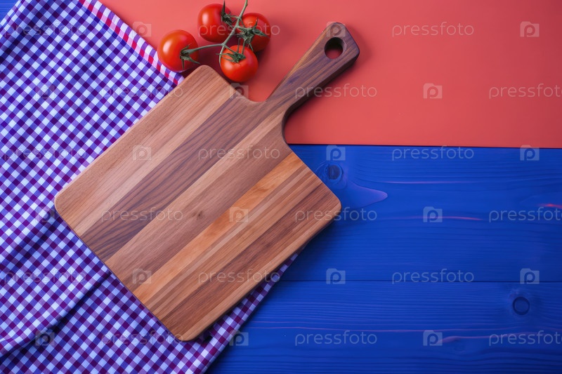 Деревянная доска для резки с свежими помидорами на красочной поверхности