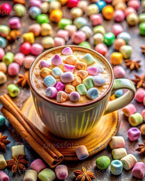 Теплая чашка капучино, окруженная красочными зефирами и пряностями на деревенском столе