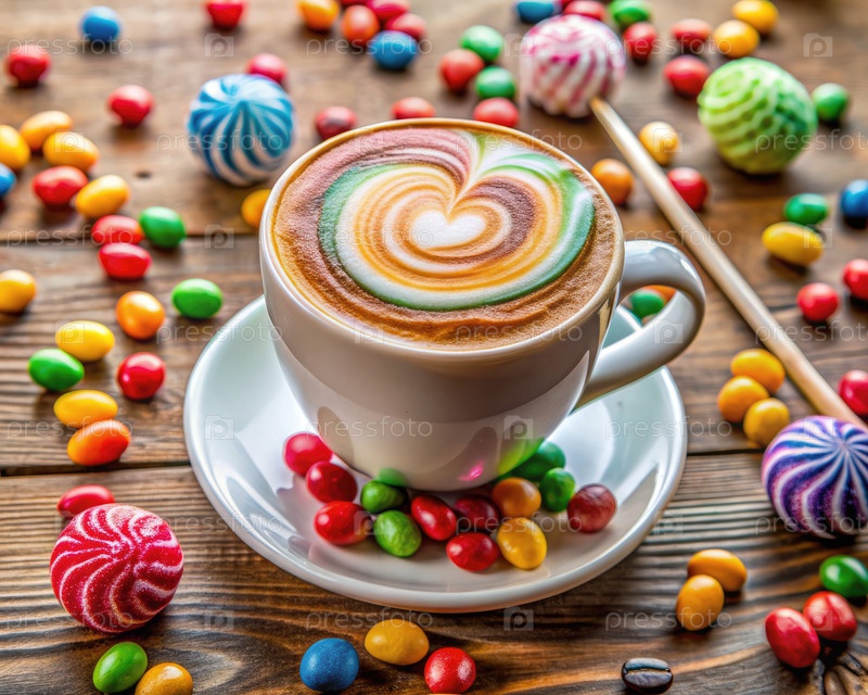 Восхитительная чашка латте, окруженная красочными маршмелоу-лолипопами на деревенском столе
