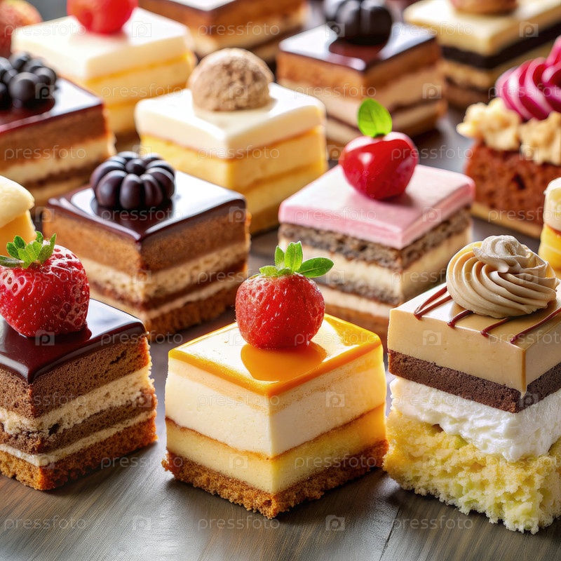 Различные кусочки торта, выставленные на деревянном столе для распространения десертов
