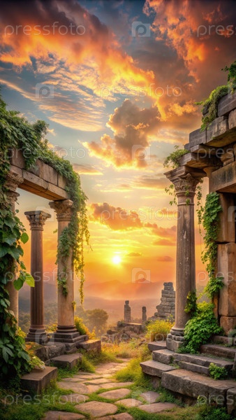 Красивый восход солнца, освещающий древние руины над зелеными холмами