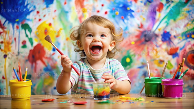 Малыш с пушистыми щеками радостно рисует яркими цветами за творческим художественным столом в игривом помещении