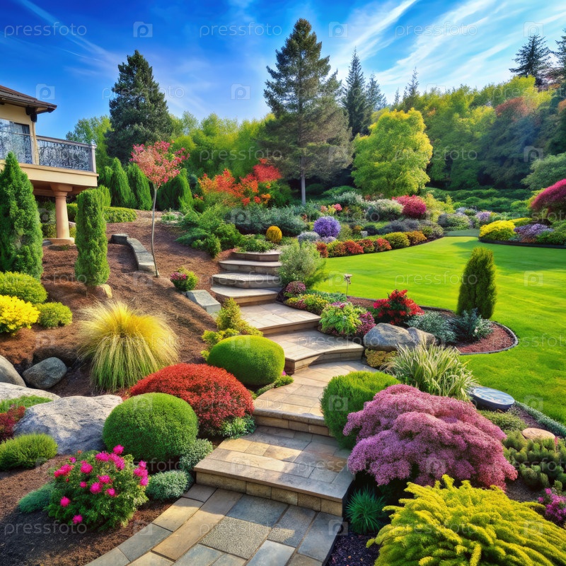 Красивый озелененный сад с извилистыми дорожками и красочными цветами весной