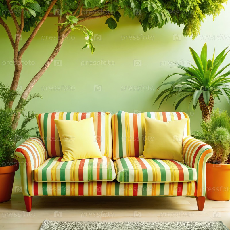 Уютный желтый полосатый диван с подушками в яркой комнатной растительной обстановке