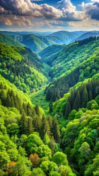 Плодоносящие зеленые долины и леса под ярким днем небом