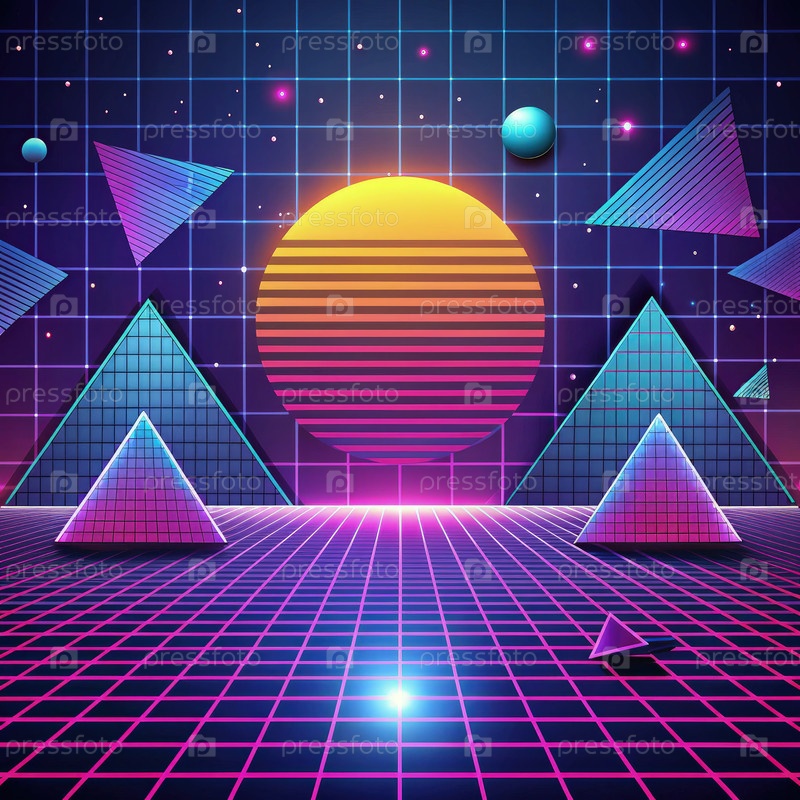 Геометрические формы с ярким закатом солнца в ретро-футуристической обстановке
