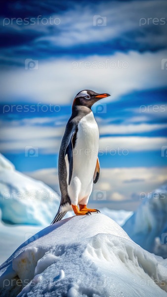 Пингвин стоит на вершине белой скалы в ярком антарктическом пейзаже