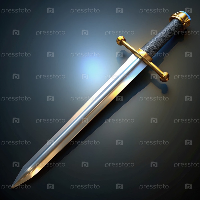 Детальное изображение меча с полированным лезвием и классическим рукоятком, отображаемым на темном фоне