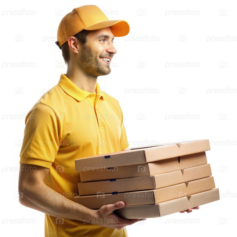 Пиццерист в желтой форме держит несколько ящиков с пиццами внутри