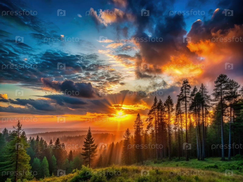 Закат над лесом с темными облаками и солнечными лучами, проходящими сквозь него