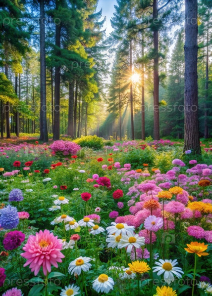Солнечный свет фильтрует через деревья в ярком цветочном саду на рассвете