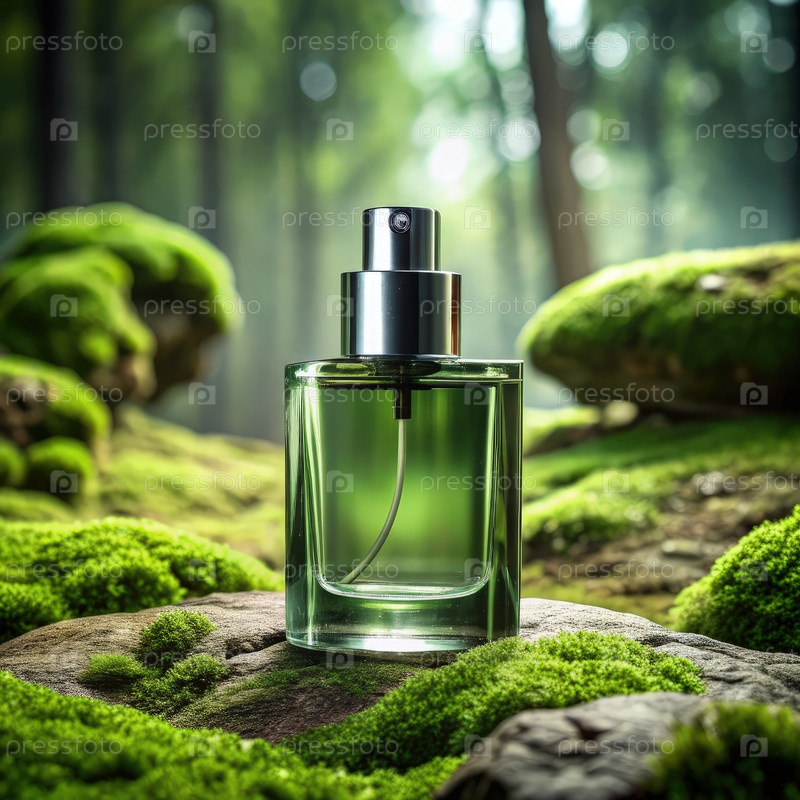 Ближайшее изображение гладкой бутылки с парфюмом в стандартном масштабе в пышной лесной местности