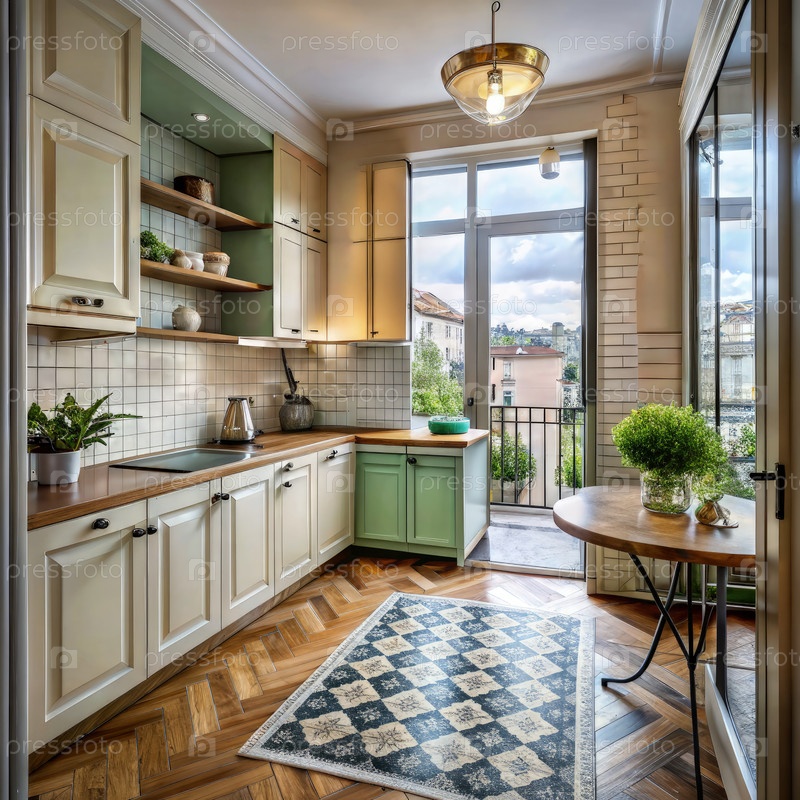 Уютная кухня с зелеными акцентами и просторным барной стойкой, в которой естественный свет проникает через большие окна