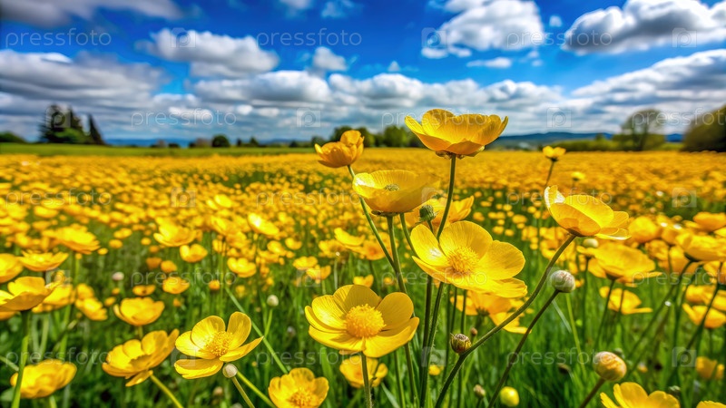 Живое поле цветущих баттеркупов под ярко-синим небом с пушистыми облаками в спокойном пейзаже во время солнечного дня весной
