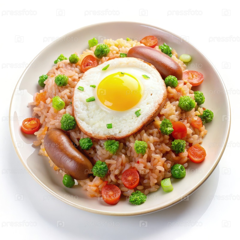 Жареный рис с колбасой и жареное яйцо подается на белой тарелке