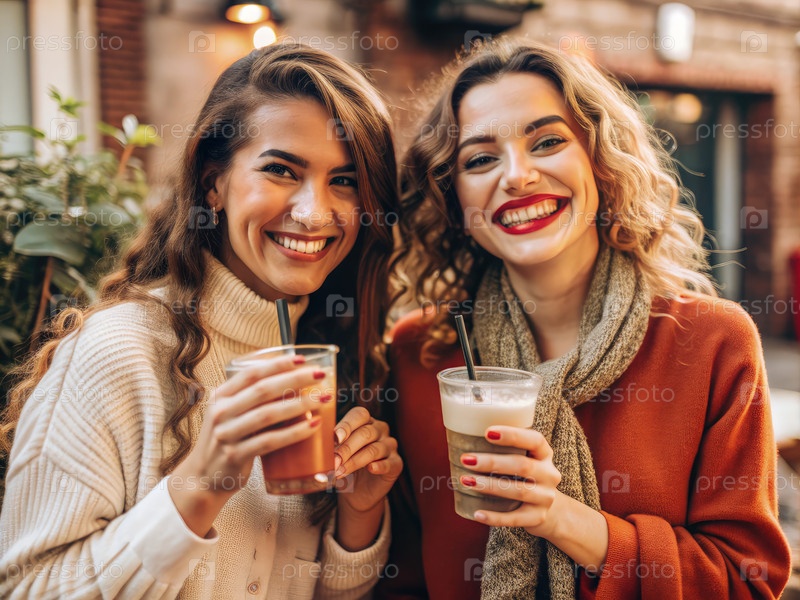 Две женщины, наслаждающиеся напитками и улыбающимися в уютном кафе днем