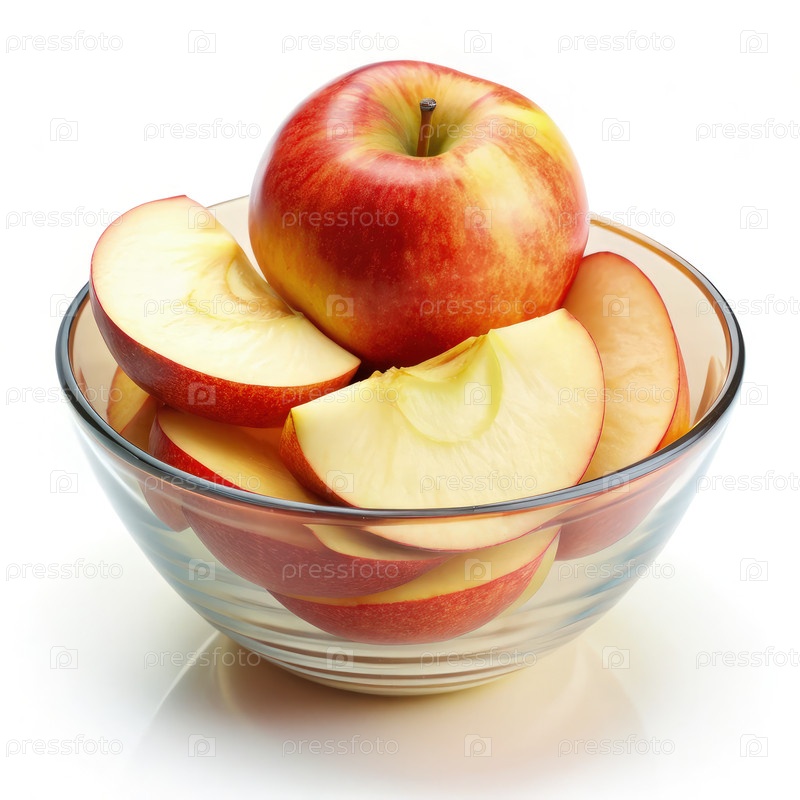 Свеже нарезанные яблоки в прозрачной таре с целым яблоком наверху на белом фоне