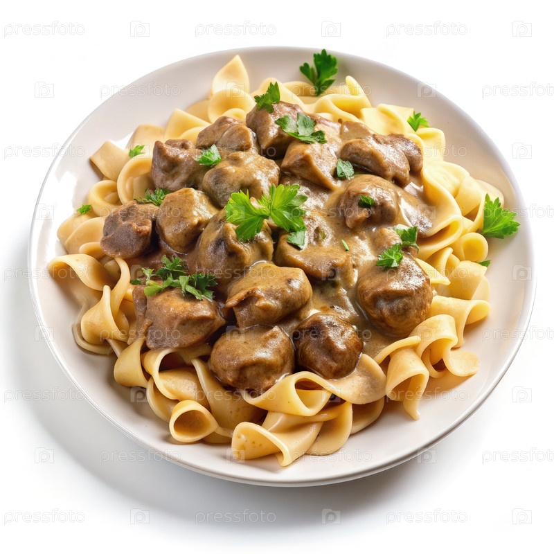 Огромная порция говядины-строганофа с нежными лапшами, украшенной свежим петрушком на чистом белом фоне