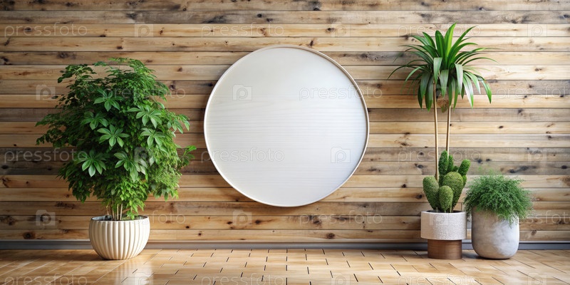 Большой белый круг висит на деревянной стене, окруженный горшковыми растениями, создавая спокойное и современное внутреннее пространство