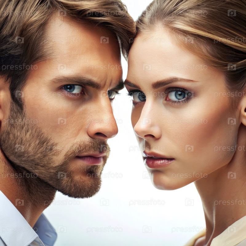 Интенсивный взгляд между мужчиной и женщиной на белом фоне