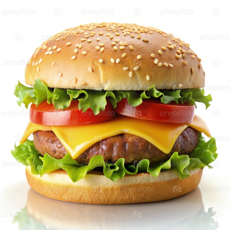 Вкусный чизбургер со слоями свежего салата, спелых помидоров и расплавленного сыра, расположенных в бутерброде с кунжутными семенами на чистом белом фоне