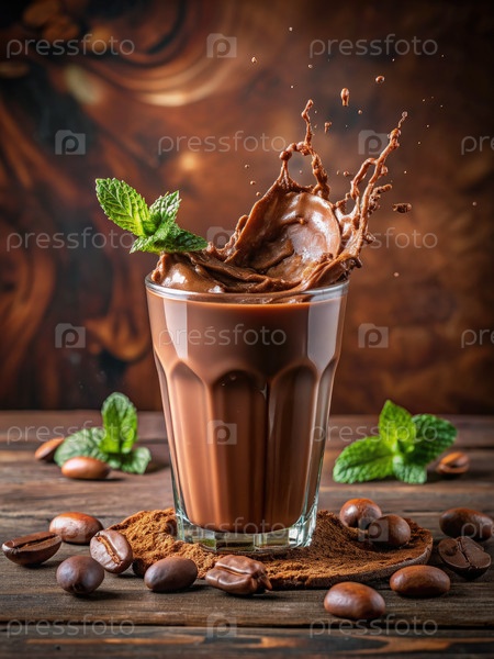 Холодный шоколадный напиток со смазкой и мятной гарнирой на деревянном столке