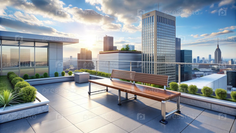 Больничная скамейка на крыше, с видом на горизонт города при закате