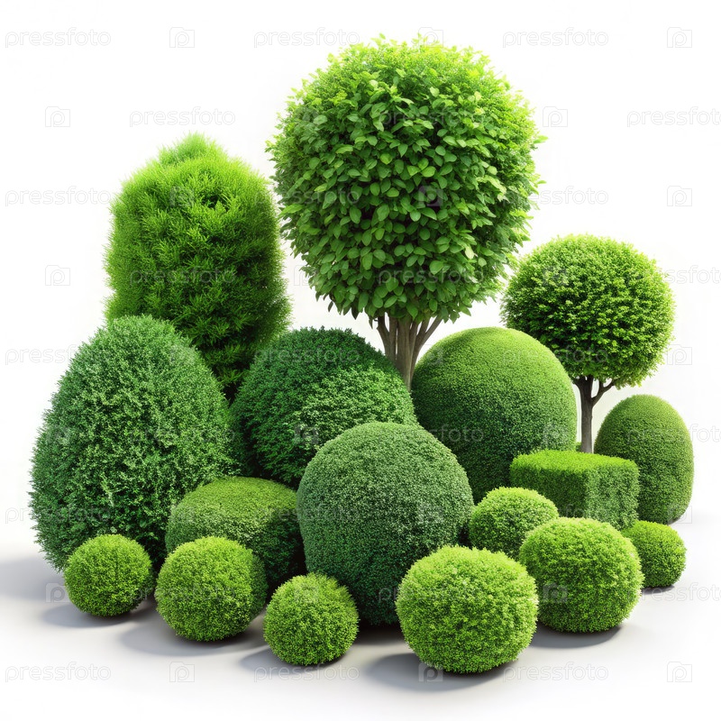 Плодоносящие зеленые кустарники различной формы, расположенные на белом фоне