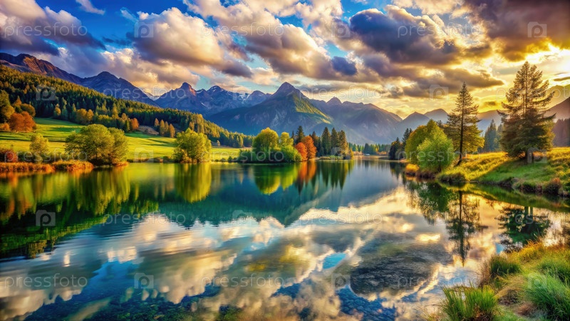 Спокойное озеро, отражающее горы и облака во время золотистого заката в природе