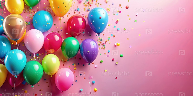 Красочные воздушные шары плавают на розовом фоне с конфетти, отмечающим радостное событие, такое как день рождения или вечеринка