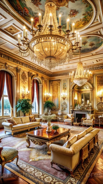 Роскошная гостиная, спроектированная так, чтобы напоминать дворец с грандиозным декором и освещением